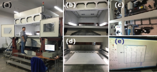 研制的大型陶瓷激光粉末床熔融装备:(a) 1.7 m装备整体图;(b, c) 采用四激光四振镜扫描;(d) 斗式双向铺粉;(e) 多扫描系统分割拼接软件